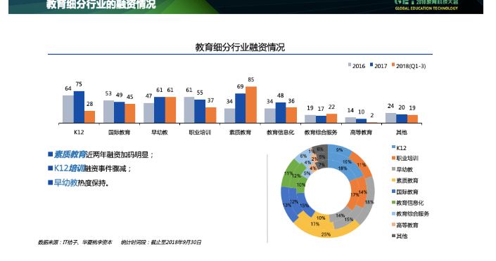 一,K12。K12都是大家公認的最大賽道,2018年K12領域融資的事件實際非常少,對比之前兩年也是腰斬的狀態。我們去看K12領域,線上基本上現在跑出來的模式還是以在線一對一為主,但是在線一對一已經出現了絕對的頭部,所以如果再想在這個領域創業,尤其在這個領域想拿到融資,實際上難度非常大。所以,這個領域的投資機會基本上就比較少了。