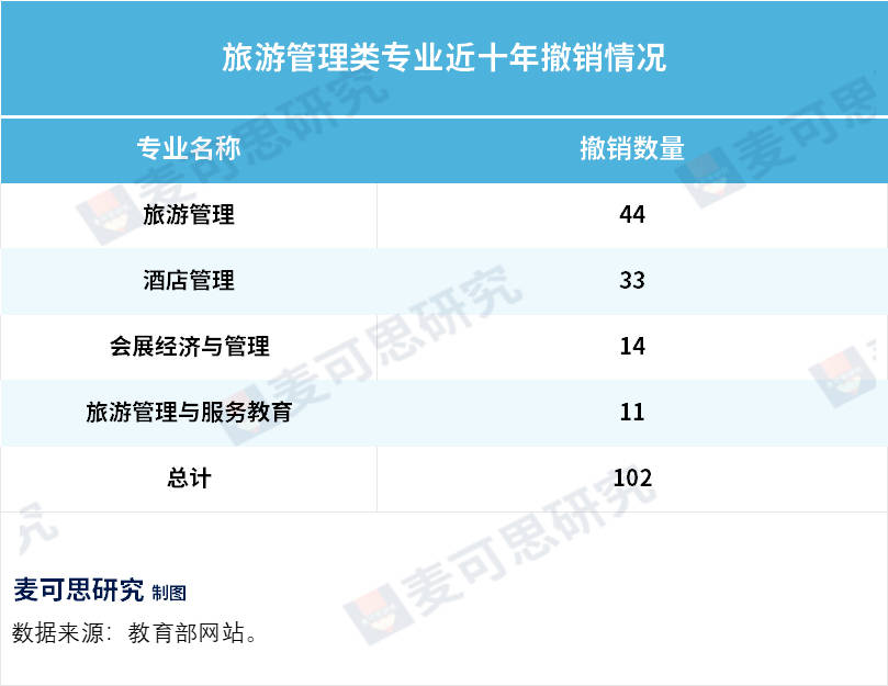 對本科高校撤銷專業(yè)名單的統(tǒng)計發(fā)現(xiàn),近十年,撤消旅游管理類專業(yè)的數(shù)量共計有102個,居于全國各專業(yè)類撤銷專業(yè)數(shù)量TOP20之列。其中,除了上文提到的旅游管理專業(yè),十年撤銷了44個以外,酒店管理撤銷數(shù)量也較多,撤銷了33個。另外,會展經(jīng)濟(jì)與管理專業(yè)撤銷了14個,旅游管理與服務(wù)教育撤銷了11個。