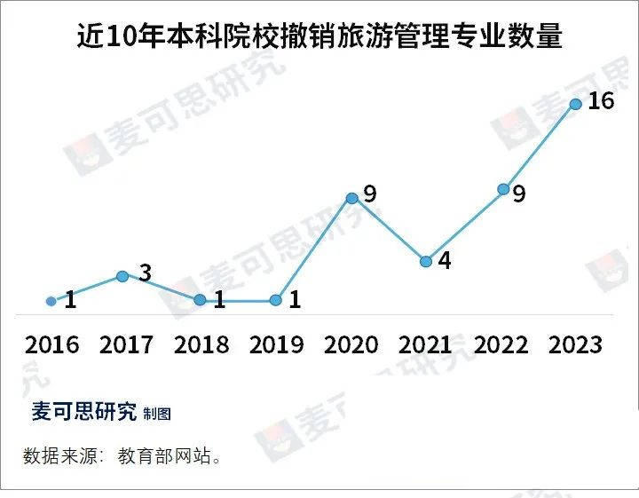這或是近年來撤銷旅游管理專業(yè)的本科高校數(shù)量增加的原因。2023年,有16所本科高校撤銷了該專業(yè)。從1998年正式進(jìn)入《普通高等學(xué)校本科專業(yè)目錄新舊專業(yè)對照表》,旅游管理專業(yè)已有近30年的發(fā)展歷史。較長的學(xué)科專業(yè)設(shè)置時間意味著經(jīng)過較長時間的積淀,相關(guān)學(xué)科專業(yè)教學(xué)經(jīng)驗和軟硬件資源或?qū)⒏S富,但可能也意味著,若無法與時俱進(jìn)對課程教學(xué)和人才培養(yǎng)方案進(jìn)行及時的修訂,人才培養(yǎng)將很難跟上時代的步伐。