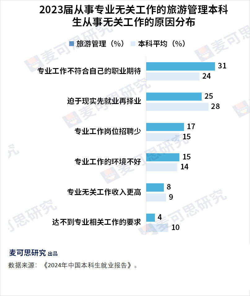 《2024年中國本科生就業(yè)報告》(就業(yè)藍(lán)皮書)數(shù)據(jù)顯示,2023屆旅游管理本科畢業(yè)生的工作與專業(yè)相關(guān)度僅為41%,遠(yuǎn)低于本科平均(72%),是工作與專業(yè)相關(guān)度最低的主要本科專業(yè)之一(另一個較低的是會展經(jīng)濟(jì)與管理專業(yè))。換言之,近六成旅游管理專業(yè)畢業(yè)生從事的工作與專業(yè)無關(guān)。較多的旅游管理專業(yè)畢業(yè)生,最終從事的工作居然是文員,結(jié)果讓人略意外。