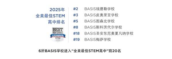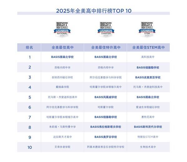 在《美國新聞與世界報道》(U.S.News&WorldReport)最新發(fā)布的2025“全美最佳高中”排名中,BASIS學校再度憑借卓越表現(xiàn)穩(wěn)居榜首。繼2024年BASIS皮奧里亞學校(BASISPeoria)拿回“全美最佳高中”之首后,今年BASIS圖森北學校(BASISTucsonNorth)強勢接棒,同時斬獲“全美最佳高中”和“全美最佳特許高中”雙料第一。在2025年“全美最佳高中”“全美最佳特許高中”“全美最佳STEM高中”排名中,BASIS學校延續(xù)了系統(tǒng)性的領先優(yōu)勢,頂尖排名穩(wěn)中有進,再次彰顯其在全美教育領域無可爭議的學術競爭力和教育影響力。