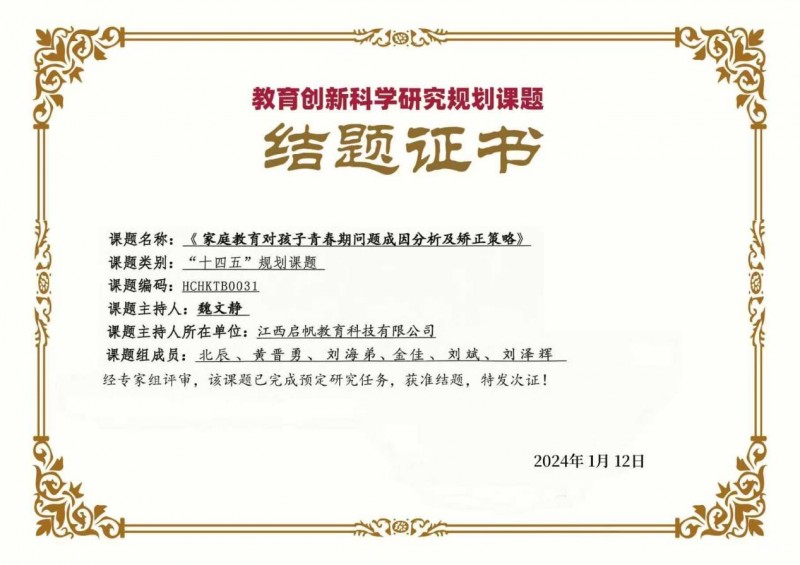 為了幫家長打破這一困境,專業靠譜的家庭教育機構啟帆教育早在 2023 年便主動申報 “十四五”規劃教育科研課題,聚焦《家庭教育對孩子青春期問題成因分析及矯正策略》這一核心主題,開啟了長達一年的深度研究,為家長尋找 “破局鑰匙”。